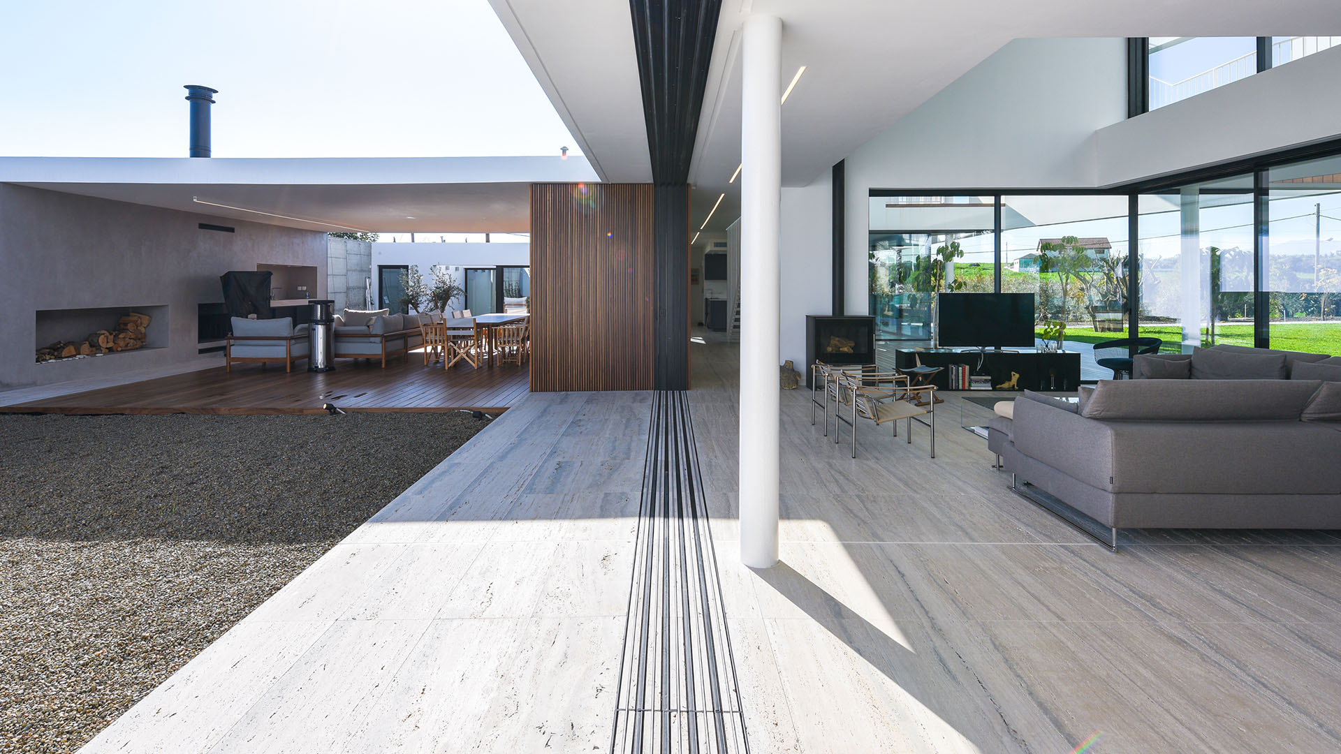 Five different threshold designs are available in two different heights (40, 57mm) making it possible to have an exposed or fully submerged threshold. Optionally the threshold comes with an integrated drainage channel which allows the track to be fully recessed into the floor while increasing the water permeability. The water extraction can also be facilitated through pipes directly installed on the track so that a drainage gutter is no longer required.